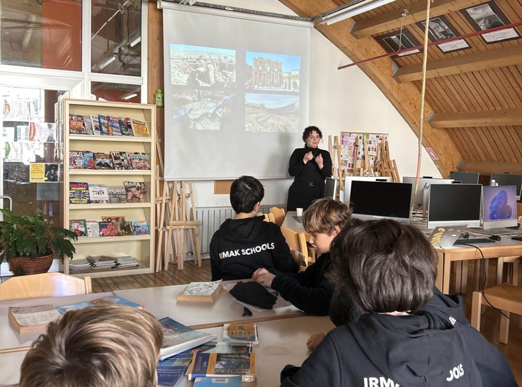 Dernek Başkanı Evren Yıldız ve İstanbul Üniversitesi Prehistorya Arkeolojisi mezunu Gül Su Eğin, arkeoloji bilimi, kazı süreçleri ve arkeologların çalışmalarında karşılaştıkları gerçek zorluklar hakkında ilgi çekici ve bilgilendirici bir sunum yaptılar.